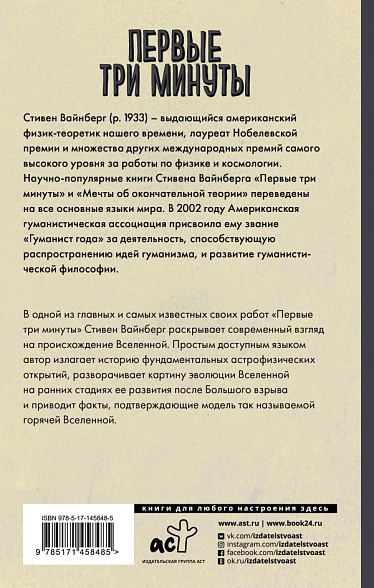 Стивен Вайнберг — американский физик-теоретик, лауреат Нобелевской и множества других международных премий за работы по физике и космологии. Его научно-популярные книги переведены на все основные языки мира. В одной из главных и самых известных своих работ «Первые три минуты» Вайнберг раскрывает современный взгляд на происхождение Вселенной. Простым доступным языком автор излагает историю фундаментальных астрофизических открытий и разворачивает картину эволюции Вселенной на ранних стадиях её развития после Большого взрыва.